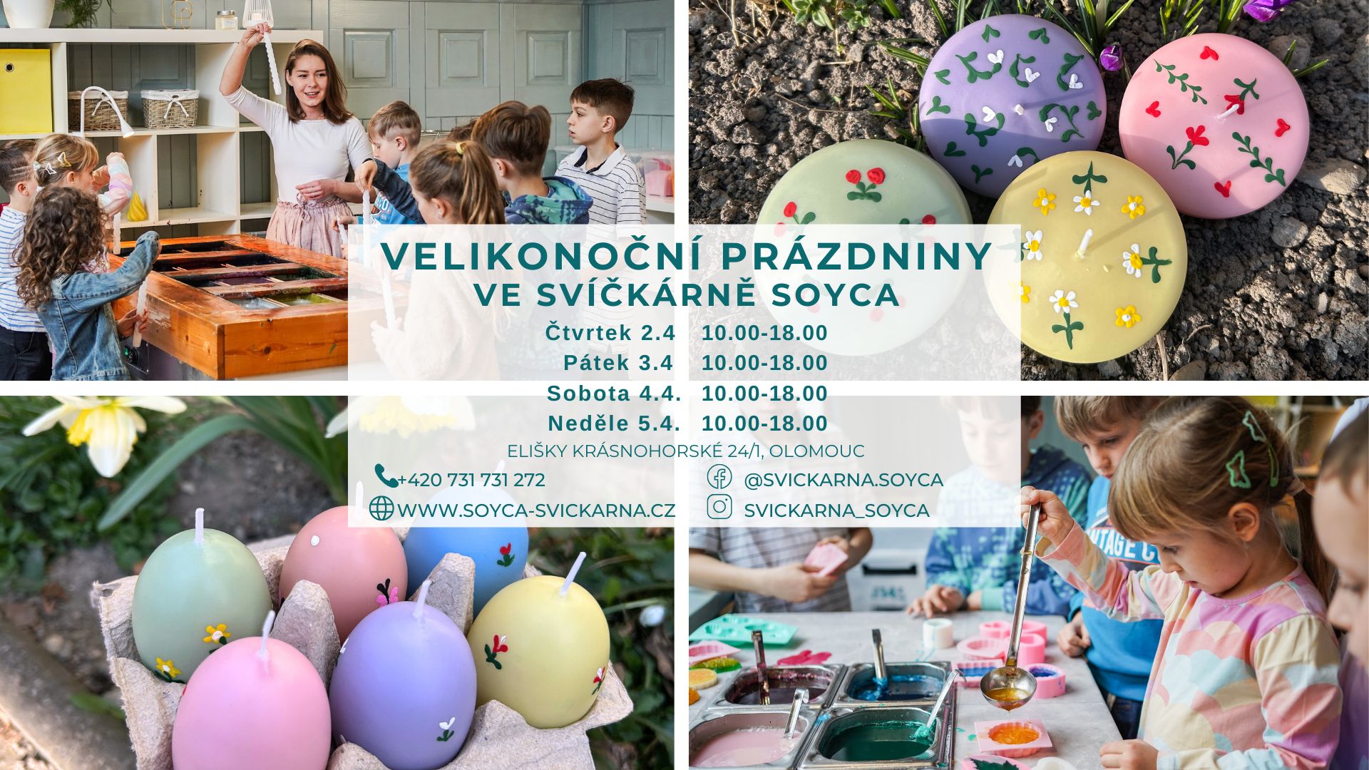 Přijďte nás navštívit v Olomouci na ulici Elišky Krásnohorské 24/1 a vyzkoušejte zcela netradiční formu zábavy a relaxu pro děti i dospělé. Dobře se o vás postaráme, vše pečlivě vysvětlíme a ukážeme, abyste si od nás odnesli krásně dárky pro sebe a své blízké. Jsme ideálním místem pro výlet pro školy, školky a rodiny s dětmi.